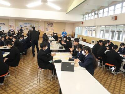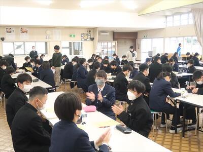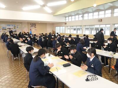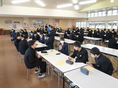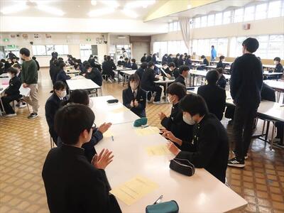 本日の朝、ランチルームで校長先生の御指導の下、コミュニケーションタイムを実施しました。今日は、班のメンバー同士で褒め合うことをしました。今まで気づかなかった自分の良いところを発見する機会にもなり、生徒一人一人の自己肯定感をあげられたことと思われます。みんな笑顔で楽しい雰囲気で活動できました。