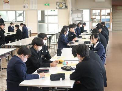 本日は1、2年生の定期テストを実施しています。本年度最後の定期テストです。生徒たちは1問1問集中して解答していました。