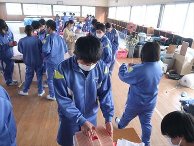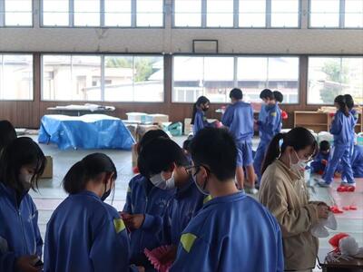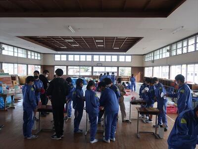 本日の6校時に1・2年生が体育館で予餞会の話合いを進めました。3年生に楽しんでもらおうと各グループでミニゲームをします。役割や準備物の確認、内容などについて話し合いました。