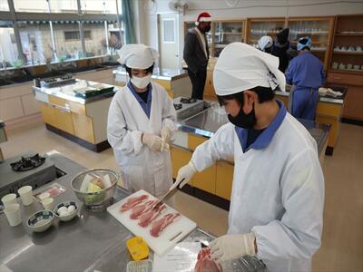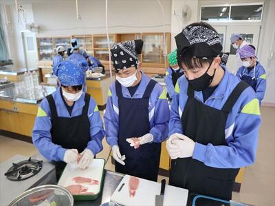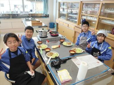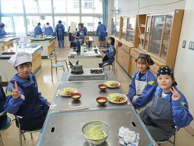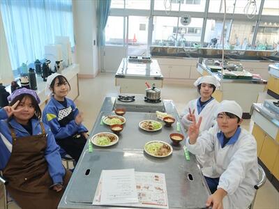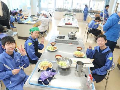 本日2、3校時に1年1組は家庭科の調理実習で豚肉のしょうが焼きを作りました。班で協力して調理し、おいしくいただきました。