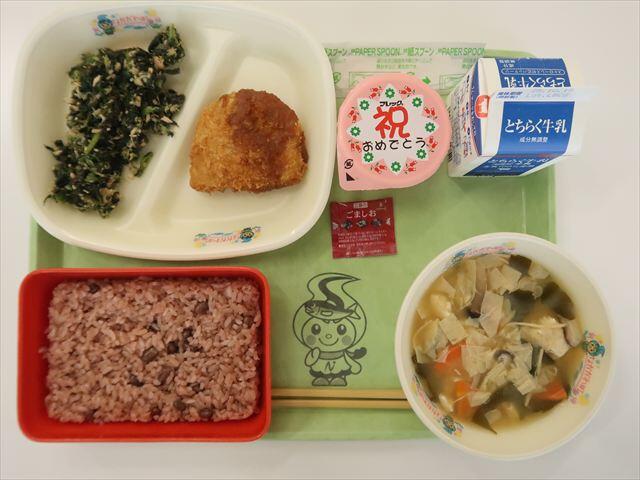 今日の給食には、お赤飯がでています。お赤飯は、日本の伝統的なお祝い料理として、特別な行事のときに食べられてきました。もち米にゆでたあずきなどを加えて蒸して作ります。あずきなどの煮汁によってもち米がほんのり赤く染まり、この色合いから「赤飯」と呼ばれるようになったと言われています。