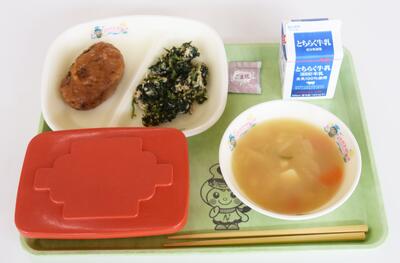 メニューは、赤飯、和風ソースハンバーグ、のり酢和え、いなか汁、牛乳です。