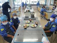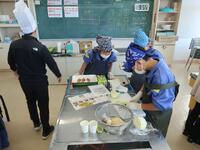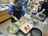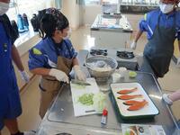 本日は、1年2組が調理実習を行いました。鮭のムニエル(千切りキャベツぞえ)とキャベツと油揚げのみそ汁を作りました。手際よく、協力して調理することができました。整理整頓しながら片付けも効率よく進めることができました。
