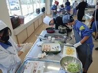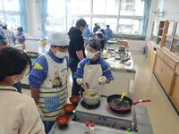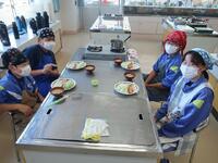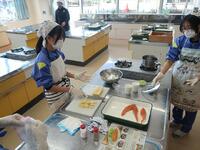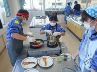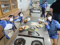 本日、1年1組家庭科の授業で、調理実習を行いました。魚の調理の学習として、「鮭のムニエル」と「キャベツと油揚げのみそ汁」を作りました。みんなで協力して手際よく調理を進め、上手にできました。「おいしかった」という感想がたくさん聞けて良かったです。