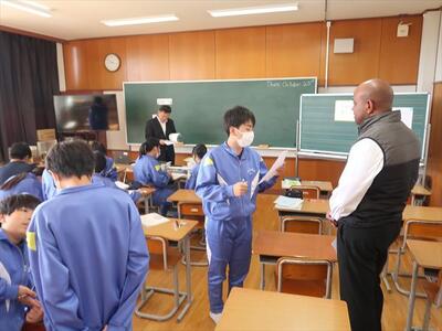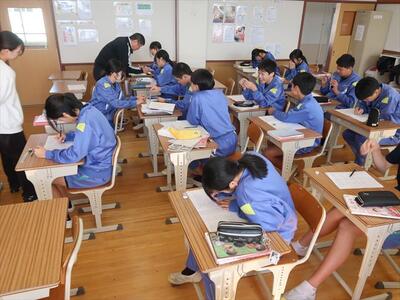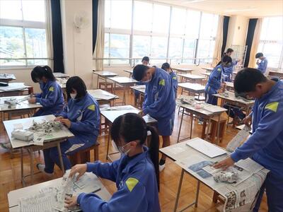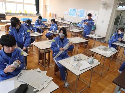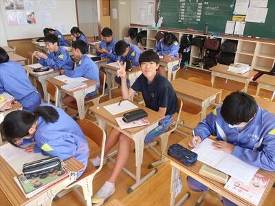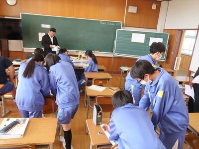 本日の6校時終了時から避難訓練を実施しました。地震が起きて、調理室から火が出て、避難するという想定です。放送機器が壊れるという想定も入れました。先生方の動きが素早いので、避難指示までの時間が短かかったです。生徒の避難も素早くできました。消防署の方からの話の中で、モバイルバッテリーの火災についての話題がありました。生徒もうなずきながら話を聞いて、人ごとではないなあと実感していました。さらに、生徒自身が火事を第一発見したときはどうする?と言う話もしてくれました。生徒たちが自分でできる3つの大事なことを聞き、これからの生活で役立ててほしいと思います。その後、消火器の使い方を学年代表が演じました。