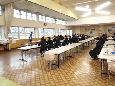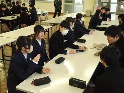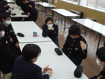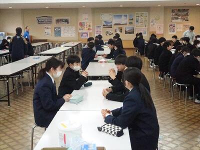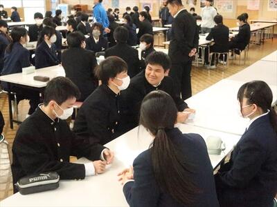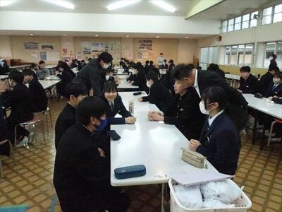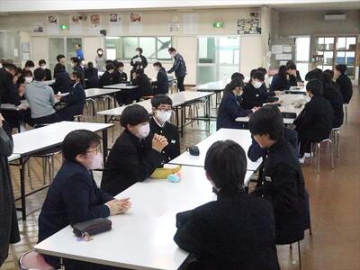本日の朝、ランチルームで校長先生の御指導の下、コミュニケーションタイムを実施しました。今日は、班のメンバー同士で褒め合うことをしました。今まで気づかなかった自分の良いところを発見する機会にもなり、生徒一人一人の自己肯定感をあげられたことと思われます。みんな笑顔で楽しい雰囲気で活動できました。